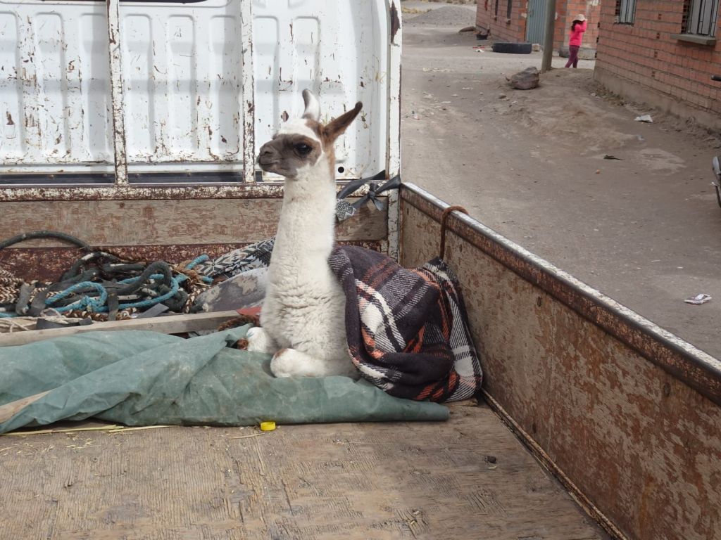Un moment, on s’arrête dans un village demander de l’eau. On frappe à une porte, et une bolivienne nous ouvre la porte… un bébé lama sous le bras. Trop chou !