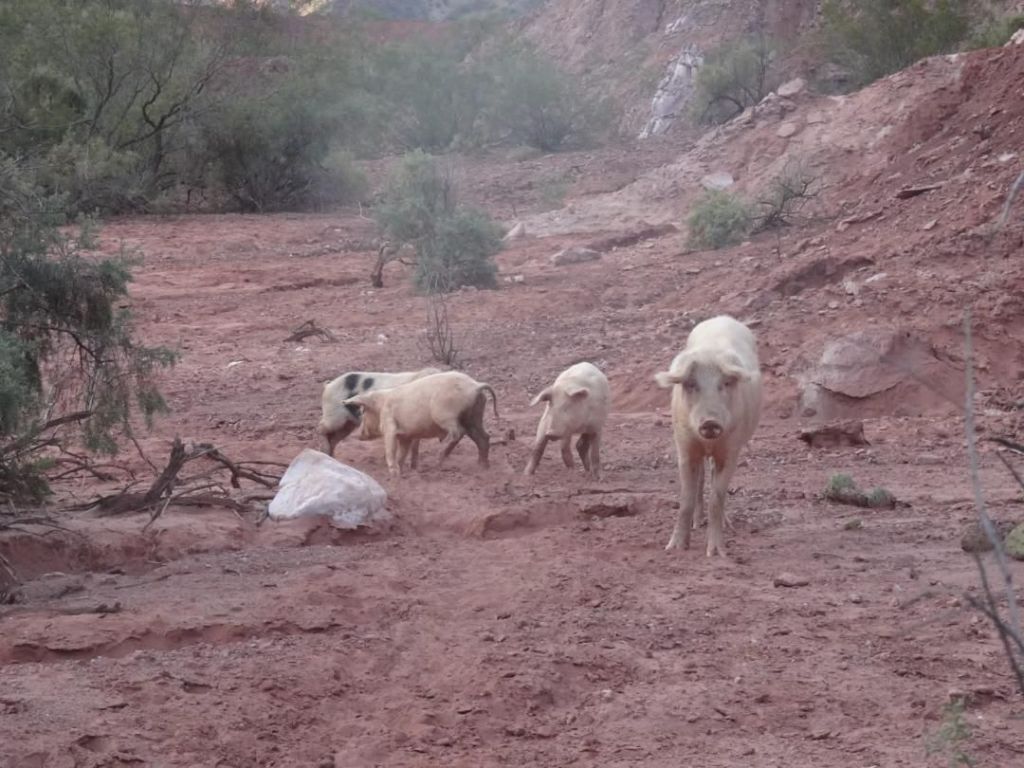 Un soir, nous plantons la tente dans une petite vallée très sableuse, entourés de petits arbres au tronc vert. On s’installe tranquillement, on bricole les vélos… Et voilà qu’on entend une cavalcade et des grognements. C’est Mama Cochon et les 3 petits cochons qui viennent nous rendre visite au milieu de nulle part !