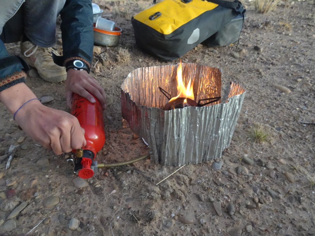 - Réchaud à essence MSR + bouteille adaptée de 1L d’essence